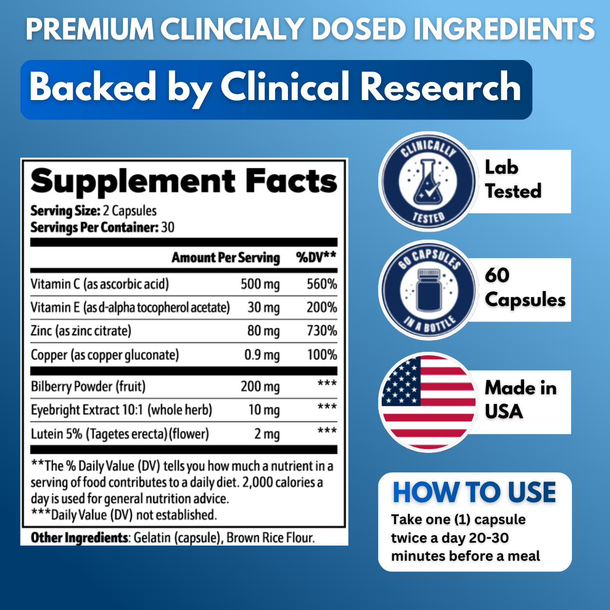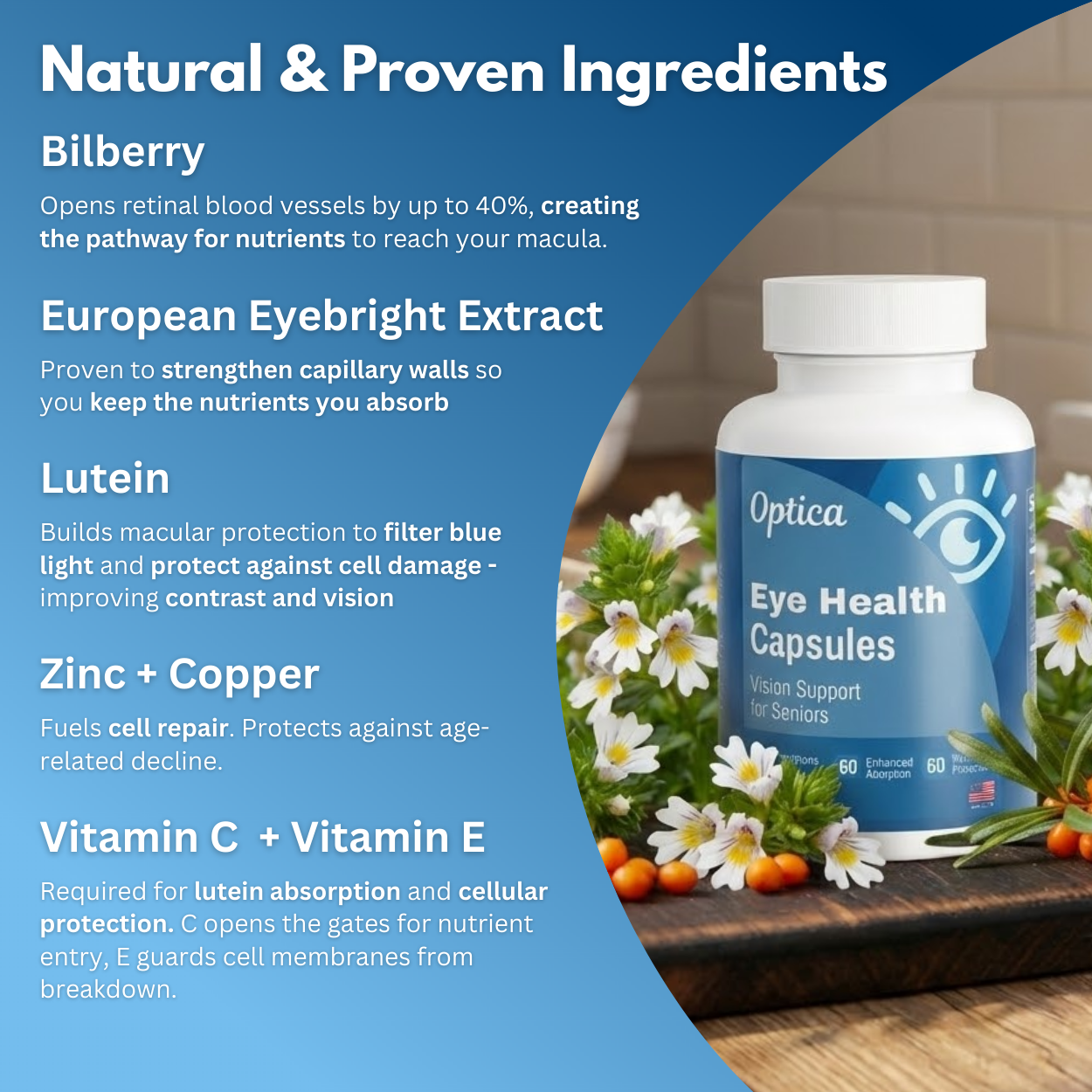 Optica uses Bilberry, Eyebright, and Lutein clinically shown to increase retinal blood flow and deliver nutrients where your eyes need them most.